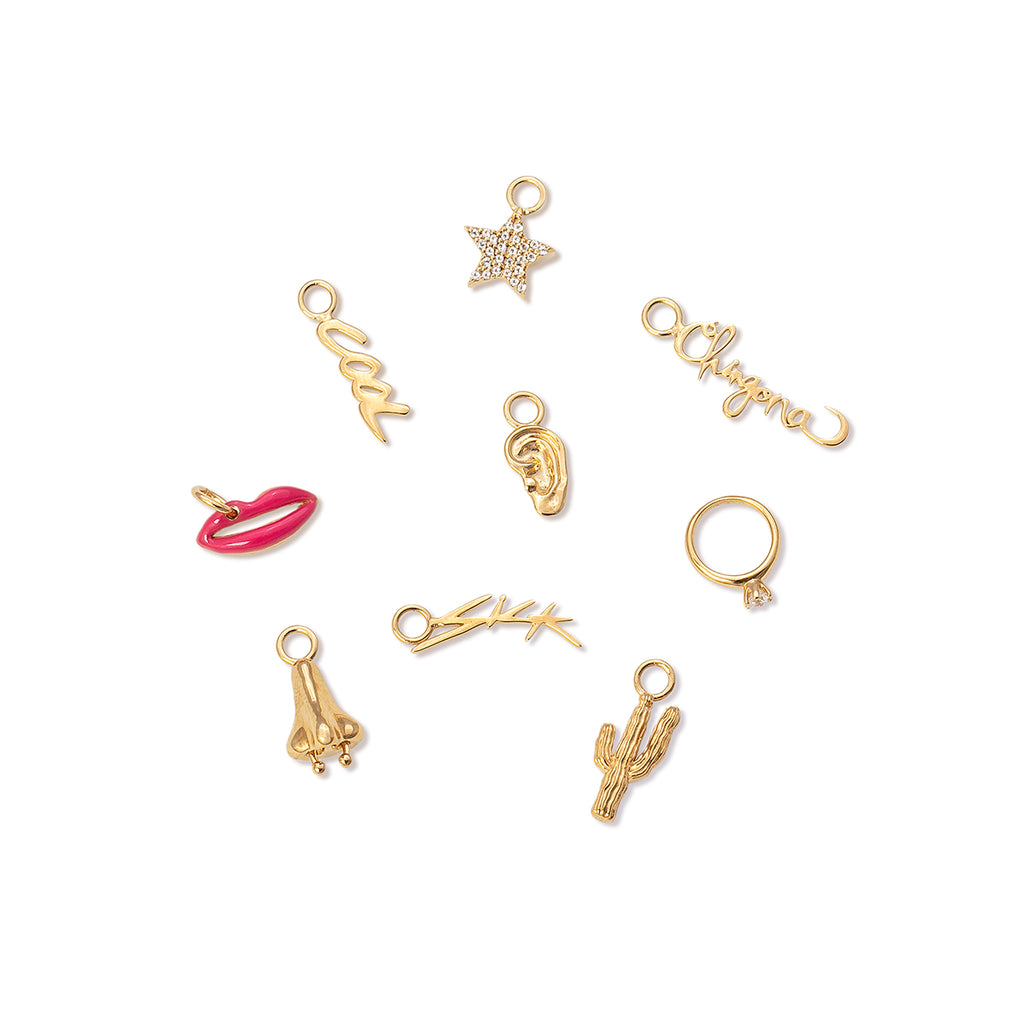 The Gold Charm Huggie by Minnie Lane is crafted in 14k gold plated over brass.