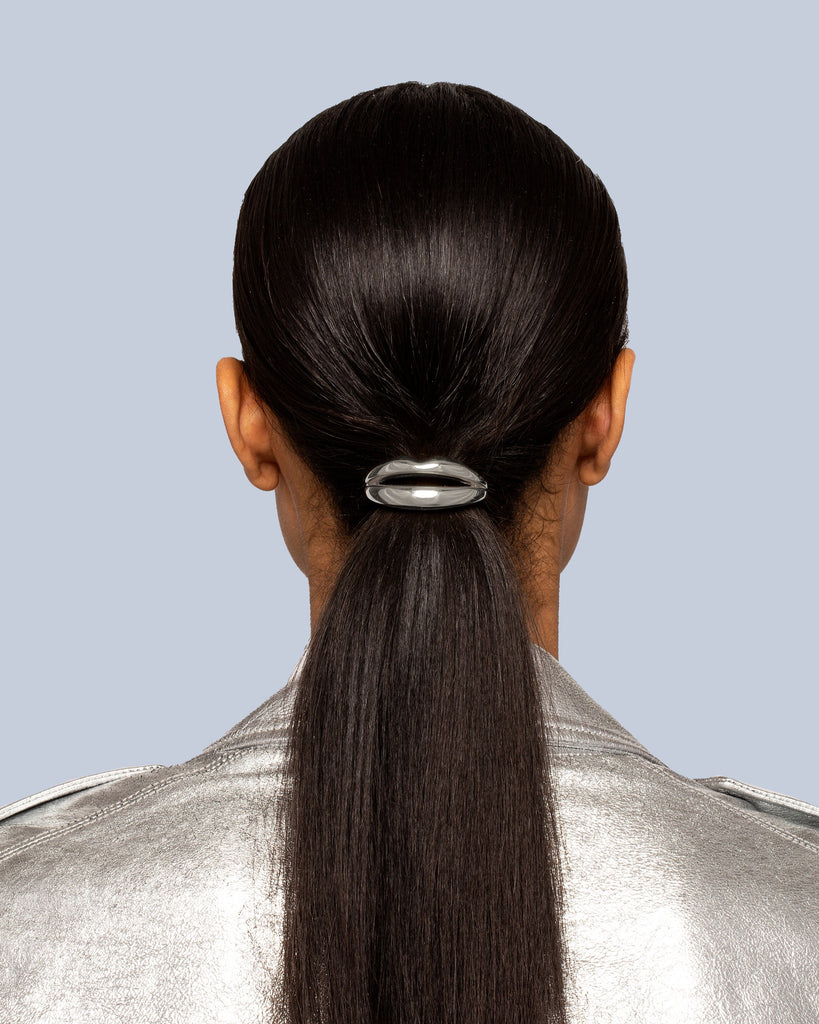 The Silver Rosie Lip Hair Band by Minnie Lane is molded in the shape of lips and designed in silver.