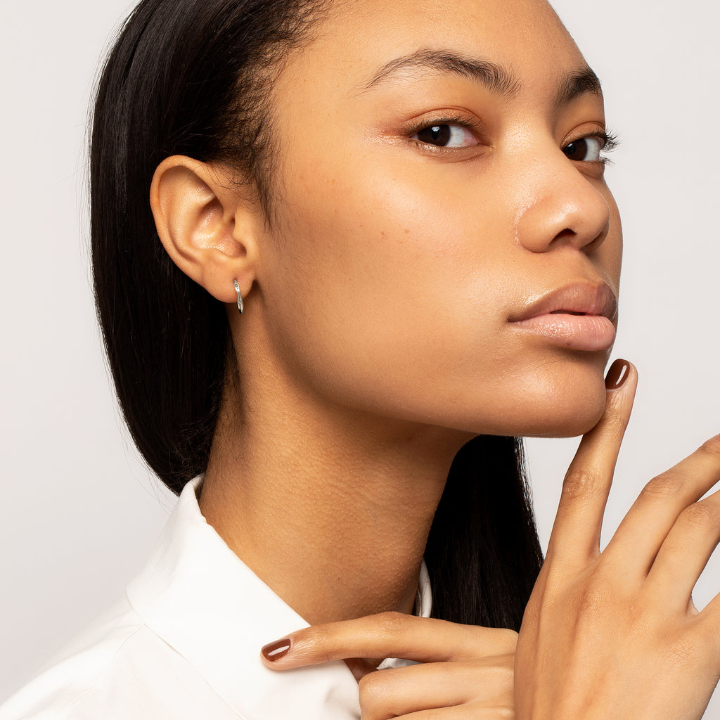 The Silver Scarlett Extra Small Hoops by Minnie Lane are designed in sterling silver.