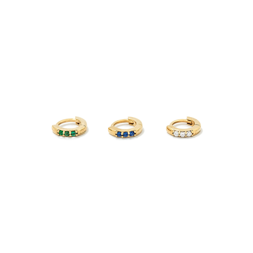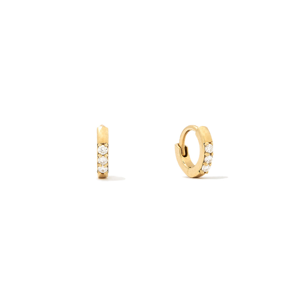 The Diamond Huggies by Minnie Lane are designed in solid 14k gold with natural diamonds. Featuring a row of natural gemstones, these huggies are the perfect way to add a little sparkle to your everyday ear stack!