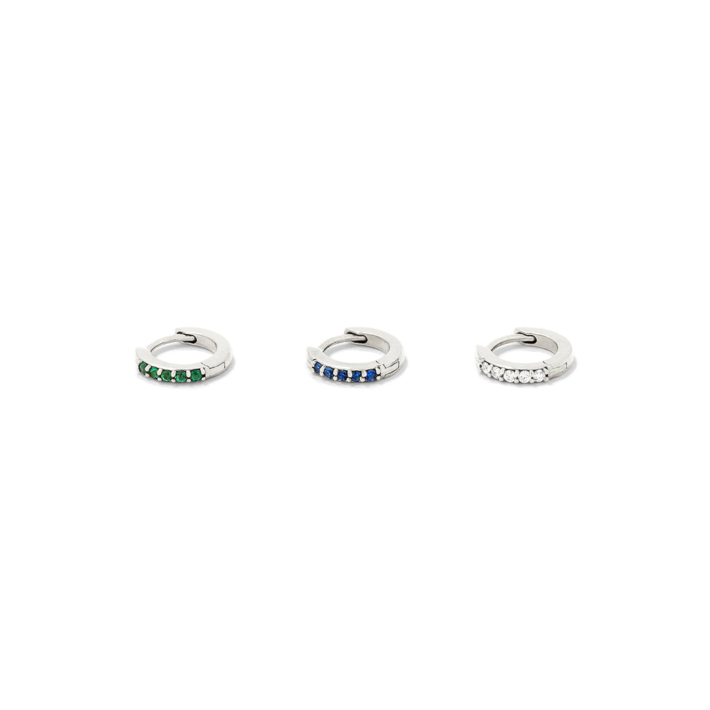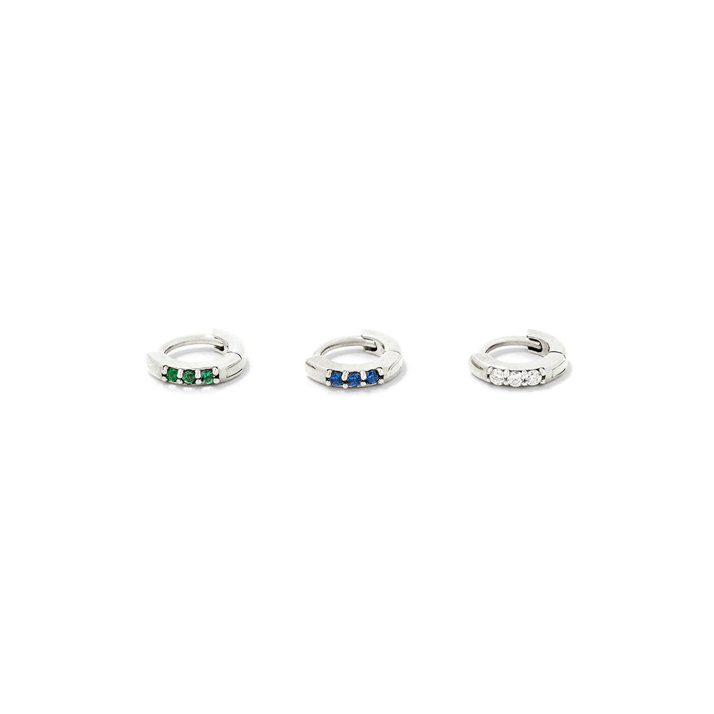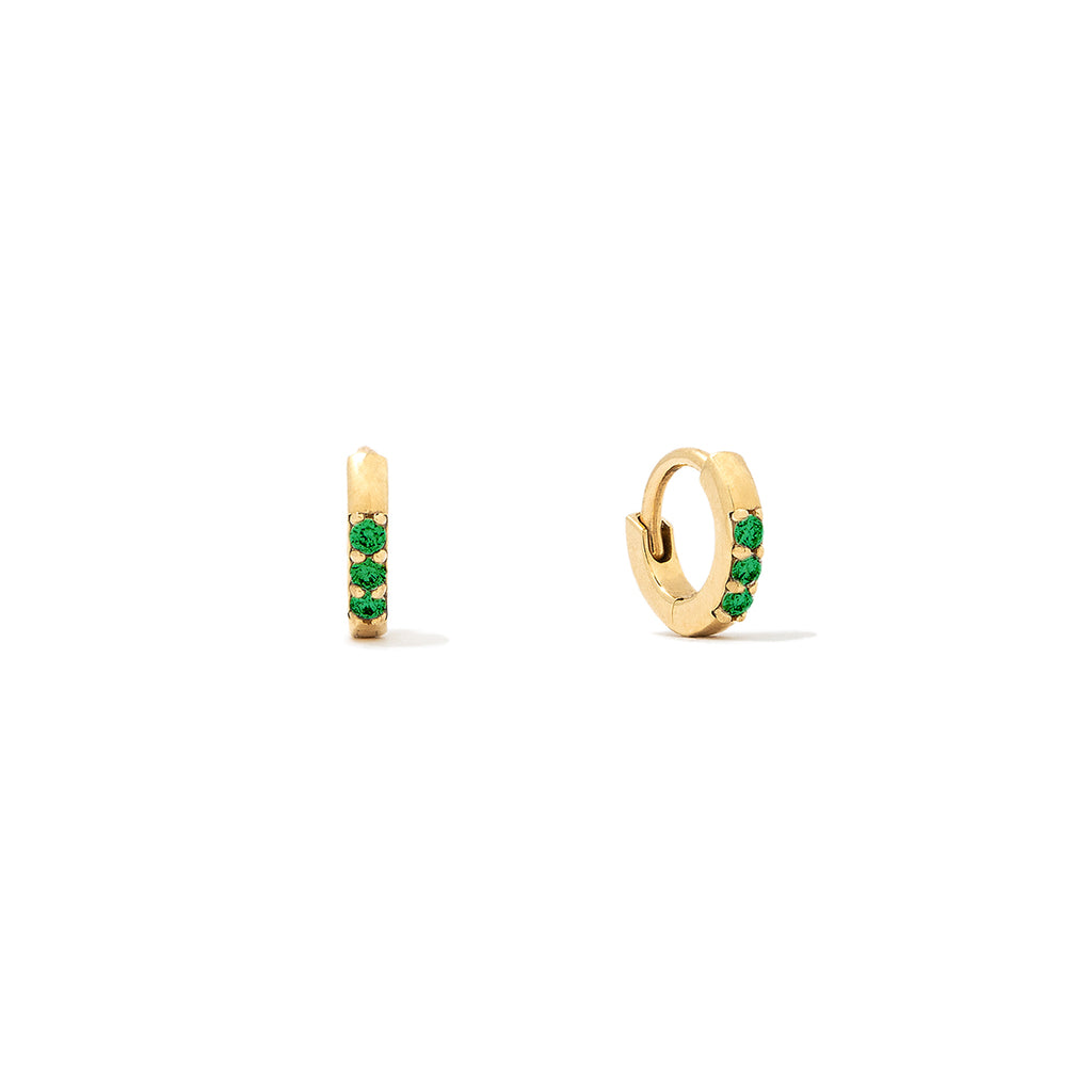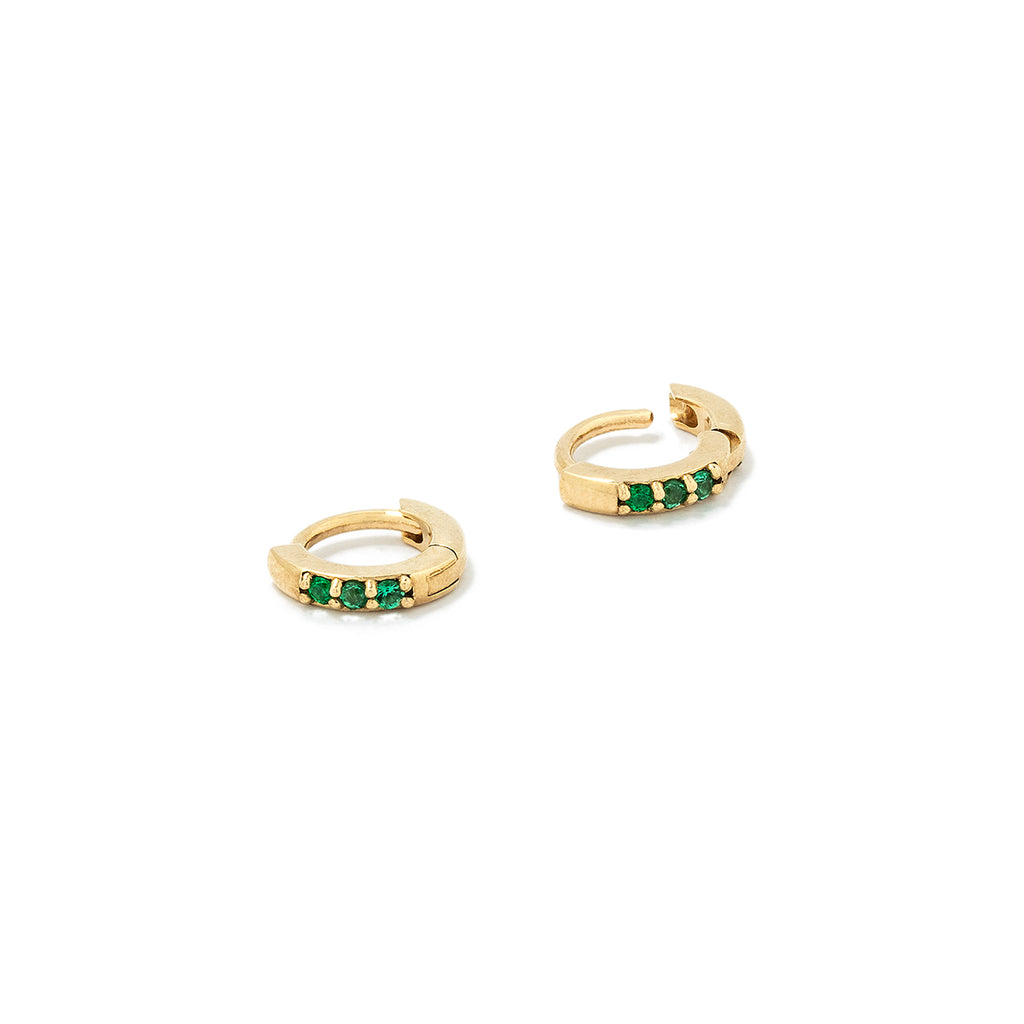 The Emerald Huggies by Minnie Lane are designed in solid 14k gold with natural emeralds. Featuring a row of natural gemstones, these huggies are the perfect way to add a little sparkle to your everyday ear stack!